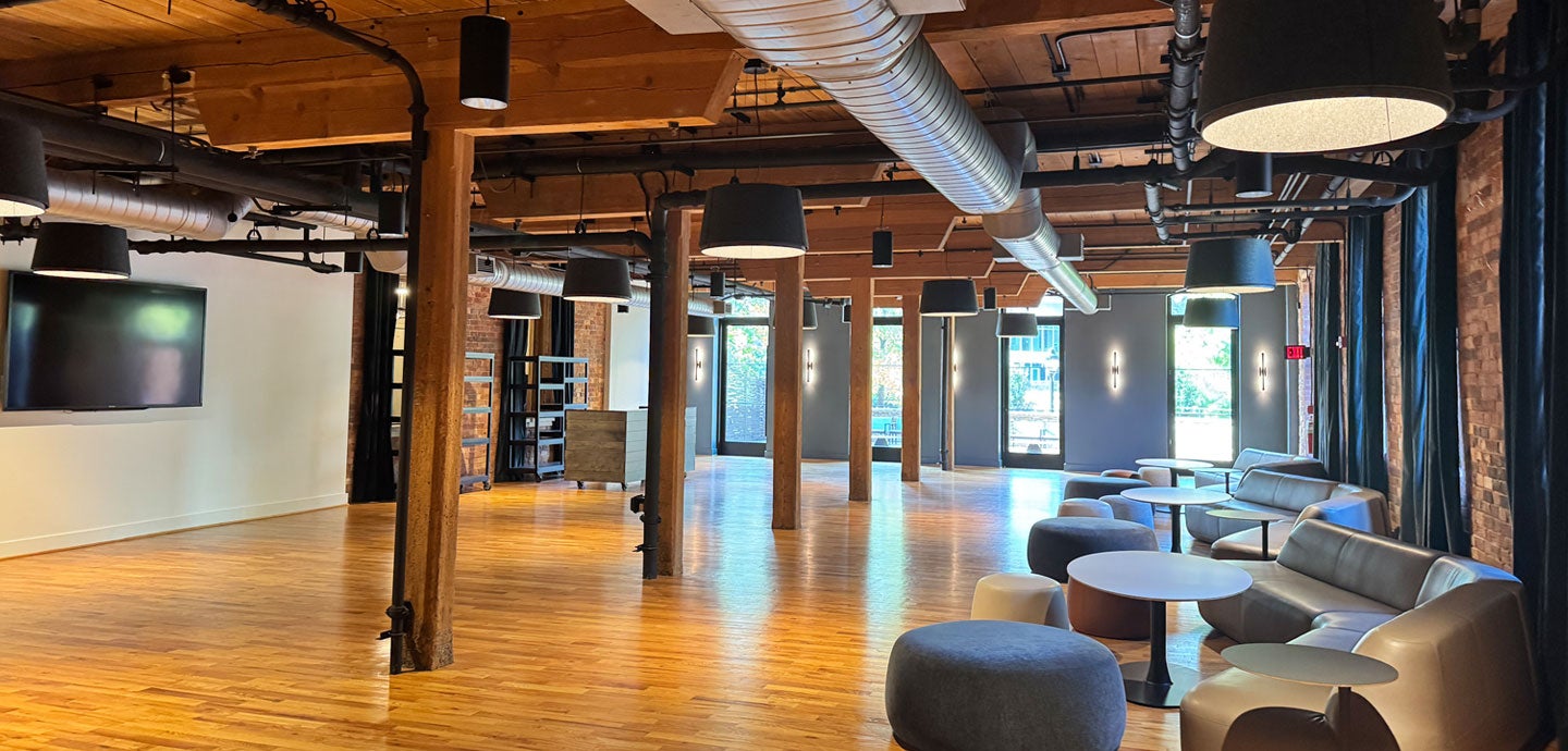 Suited for smaller gatherings, the Ramsaur Studio’s warm tones and wall of windows create an inviting atmosphere for intimate receptions, workshops, master classes, and small group training sessions. Enjoy a breath of fresh air from the attached outdoor patio overlooking the river.